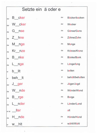 Merkwörter mit Ä/ä üben Setze die passenden Wörter ein Es krabbelt und hat sechs Beine In der Klasse sind Jungen und Der erste Frühlingsmonat ist der Der Tischler schneidet das Brett mit der Geschichten mit Hexen, Zwergen und Riesen sind Paul isst gerne Brot mit Zu einigen Wörtern mit Ä, ä gibt es kein. In Swedish and Estonian, regional variation, as well as the letter's position in a word. Erklärung Normalerweise sind die Wörter mit ä von Wörtern mit a abgeleitet Deswegen schreiben wir in der Regel ä, wenn es verwandte Wörter mit a gibt, und e, wenn es keine gibt Beispiel er lebt (leben) → wir schreiben e er gräbt (graben) → wir schreiben ä Wege (Weg) → wir schreiben e Täler (Tal) → wir schreiben ä ehrlich (Ehre) → wir schreiben e.