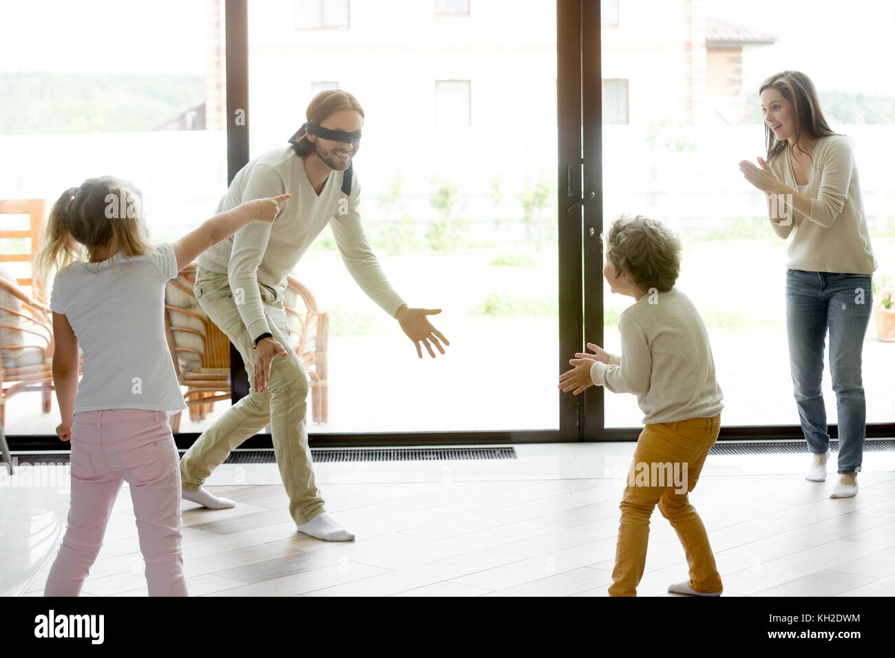 Gluckliche Familie Von Vier Spielen Lustig Verstecken Und Spiel Zu Hause Suchen Mit Verbundenen Augen Vater Mutter Oder Kinder Eltern Und Kinder Spass Laug Zu Fangen Stockfotografie Alamy