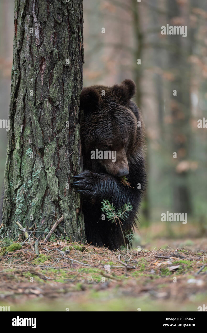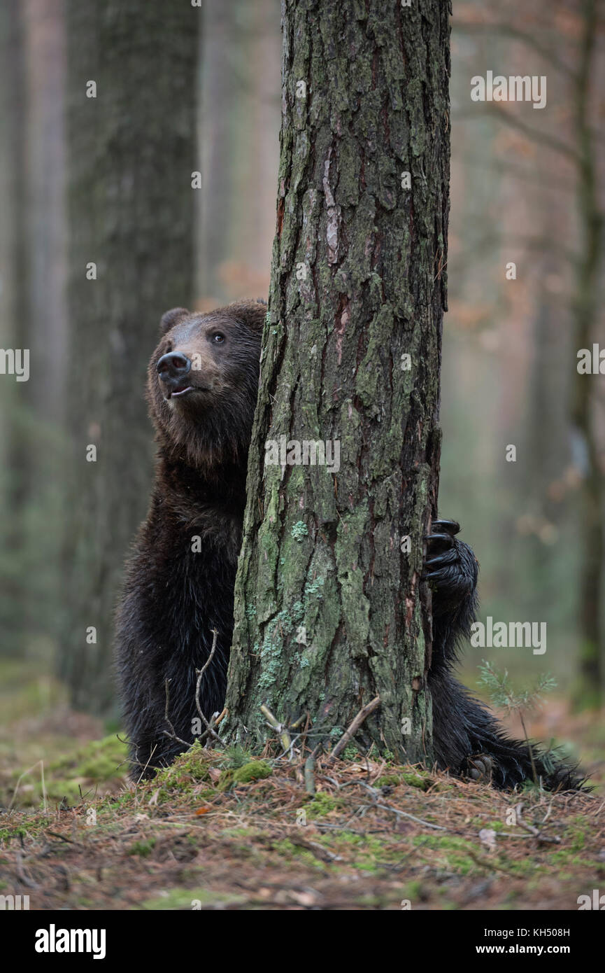Europaische Braunbaer Braunbar Ursus Arctos Verspielten Cub Steht Auf Den Hinterbeinen Versteckt Hinter Einem Baum Spielen Verstecken Und Suchen Sieht Lustig Europa Stockfotografie Alamy