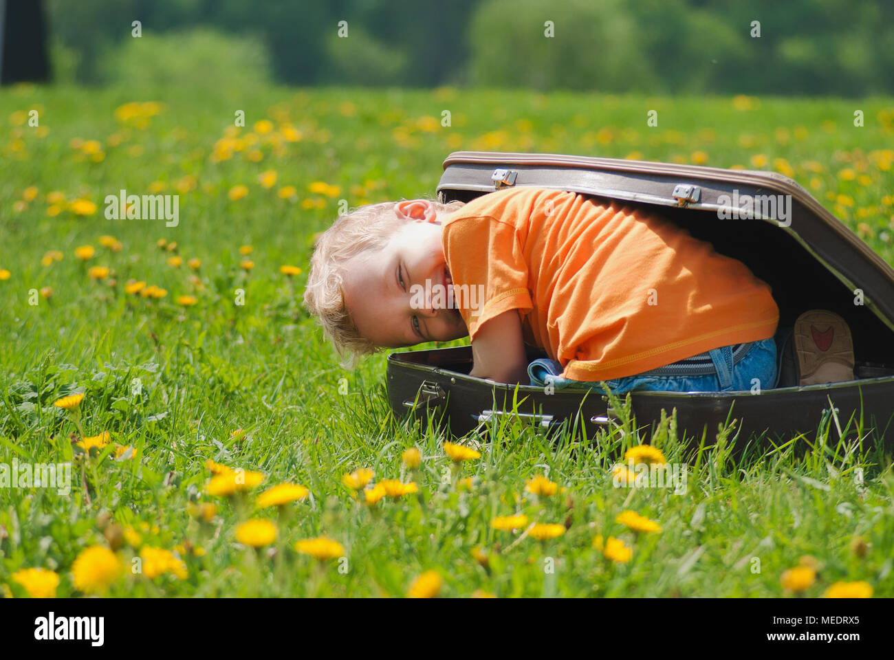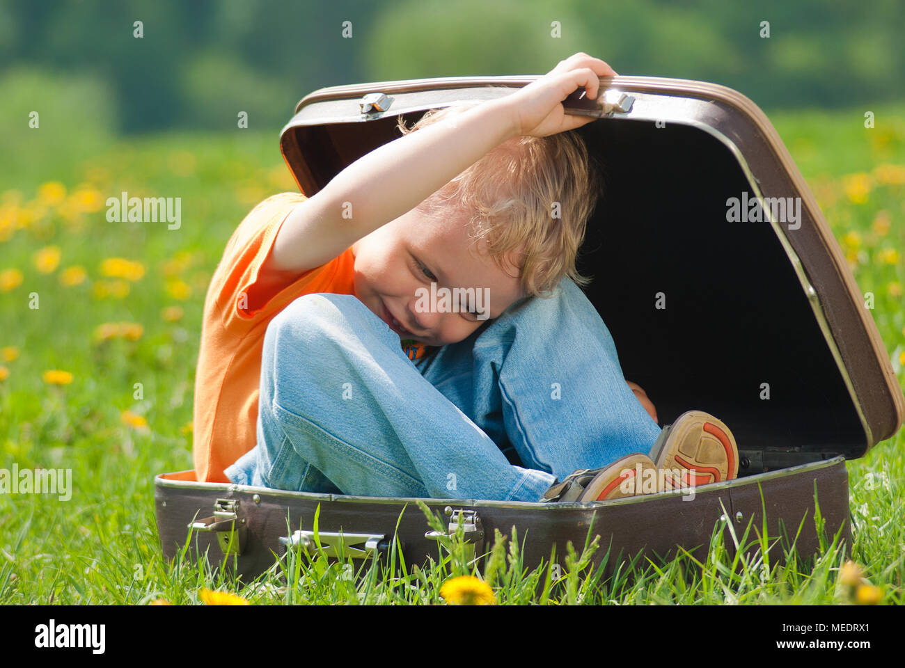Susse Kleine Lustige Kind Das Versucht Innerhalb Von Vintage Braun Koffer Zu Verstecken Junge Lacht Und Lachelt Glucklich Beim Spielen Im Freien Auf Grunen Rasen Voll Stockfotografie Alamy