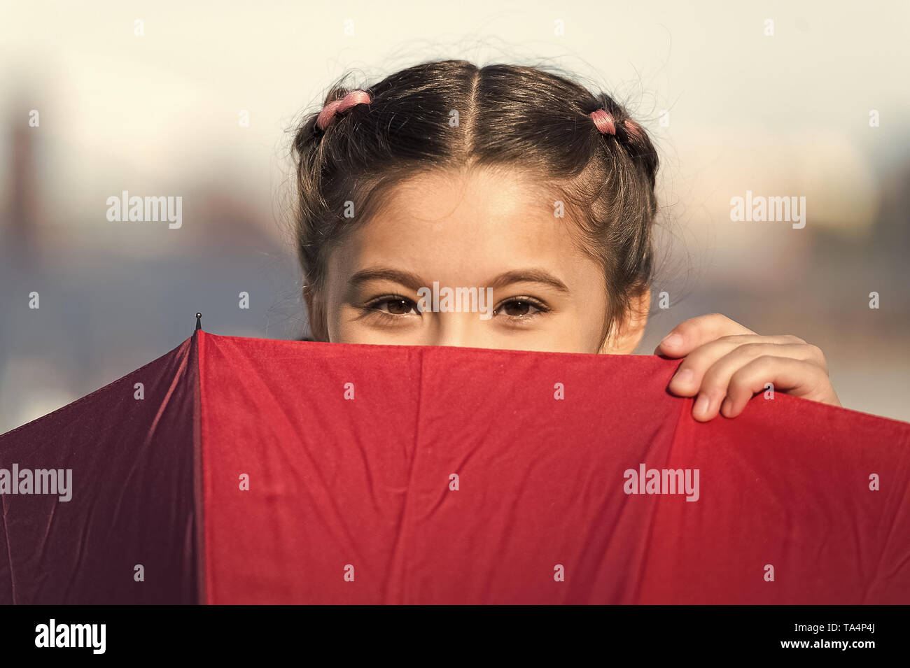 Spielen Verstecken Und Suchen Lustig Junge Madchen Verstecken Von Jemand Schone Helle Augen Madchen Mit Schirm Die Spiel In Lustige Stimmung Ohne Probleme Und Schwierigkeiten Der Kindheit Spielen Im Freien Stockfotografie