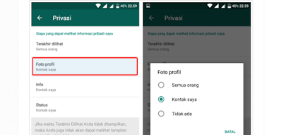 Untuk mengatur privasi foto profil ada pada menu Setelan » Akun » privasi » Foto profil 2 Fotonya diset hanya dia yang dapat melihat Alasan kedua adalah karena dia memang menset foto profilnya hanya dapat dilihat oleh dia seorang Seperti merujuk pada penejelasan di point pertama di atas 3 Kontak kita telah ia blokir. Foto profil kosong itu biasanya digunakan oleh cewek yang lagi galau, entah kenapa sih mereka menghapus potonya saat keadaan hatinya tidak menentu Tapi enggak ada larangan juga kok kalau kalian lakilaki dan pengen menggunakannya, dan bisa dimulai dari penjelasan berikut. Apakah kalian memakai foto kartun/anime sebagai foto profil memang karena kalian suka atau agar foto profil kalian tidak kelihatan kosong?.