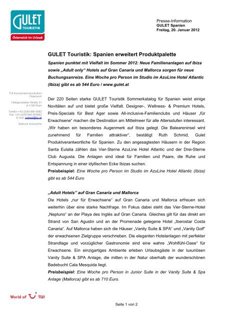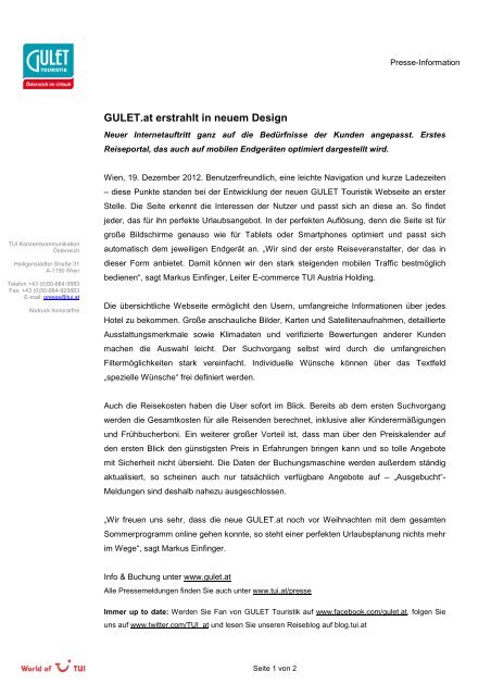 Kategorie Reiseveranstalter 1 wwwguletat (agindo) 2 wwwpanoramatourscom (diamonddogs) 3 wwwgeoat (GEO Reisen Incentive & Marketing Gmbh) Somit gibt es keine wirklichen Überraschungen bei den siegreichen Agenturen. TUI Österreich ist Österreichs führender Reiseveranstalter Neben unserer Hauptmarke TUI gehören zahlreiche andere bekannte Marken wie GULET, 12FLY, airtours, Terra, Worldwide Active, Gebeco und Dr Tigges zur World of TUI. Buchen Sie LastMinute Reisen, Pauschalreisen oder Cluburlaub auf GULETat!.