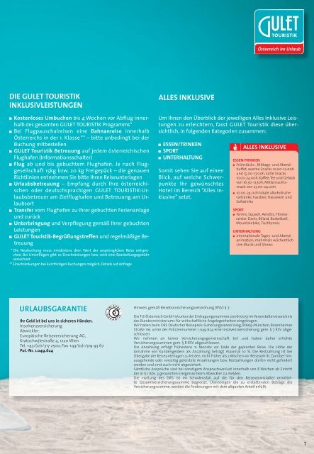 GULET ist die österreichische Marke von TUI und stellt in der “rotweißroten Urlaubswelt” Angebote zusammen, die auf die Bedürfnisse österreichischer Urlauber zugeschnitten sind Der Reiseveranstalter trifft aus dem riesigen Angebot der World of TUI eine Vorauswahl mit den beliebtesten Reisezielen, Hotels, Resorts und Clubs. Einige Reiseveranstalter haben laut AK heuer die Prämien für die Reiseversicherung erhöht, aber die Summen für die wichtigsten, versicherten Leistungen nicht verbessert Einige AKTipps.