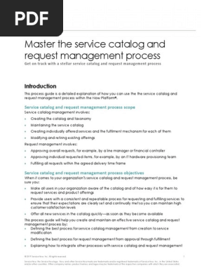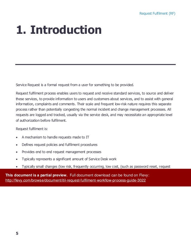 Request Fulfillment Process The aim of this document is to define the purpose, scope, principles and activities of the Request Fulfillment process The document is optimized for small and mediumsized organizations – we believe that overly complex and lengthy documents are just overkill for you There are 3 appendices related to this document. 13 Service Request Process Scope The Service Request process applies to all specific. Tip Document all service request requirements (question data, approval process, fulfillment procedures, fulfillment team, process owner, service level agreements, reporting, etc) before adding to the request catalog For requests, capture all necessary data from the customer using prefilled forms and specific, limited and actionable options.