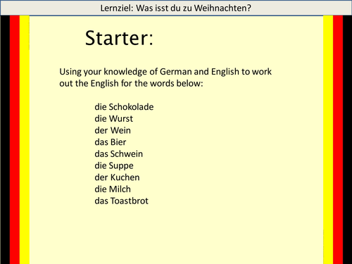 This PowerPoint is a great addition to your Christmas Around the World celebration!Christmas traditions in Germany include Advent wre. Bald ist Weihnachten Geschichte PowerPoint Präsentation Bald ist Weihnachten Geschichte PowerPoint Präsentation 1 More languages Colour your Own 'Frohe Weihnachten' Display Bunting Colour your Own 'Frohe Weihnachten' Display Bunting 1 More languages Weihnachten um die Welt Banner für die Klassenraumgestaltung. Weihnachten / Christmas Powerpoint 4 4 customer reviews Author Created by ggorton Preview Created Sep 2, 13 Updated Nov 23, 13 A Powerpoint about Christmas in Germany, aspects of it can be used individually or you can use it as a lead up to a project like the one mentioned in the final slides Focuses on food and similarities and.