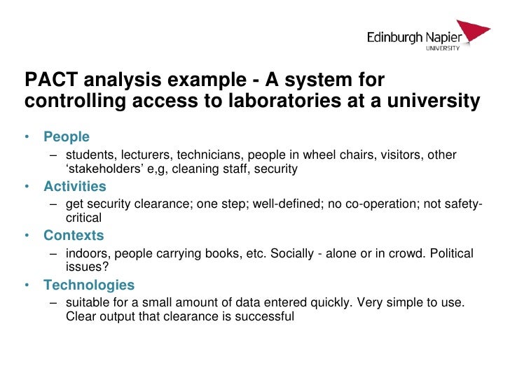PACT analysis is defined as a user requirement document that is used for a more detailed design brief This analysis is a way of reflecting about people, activities, content and lastly technology (PACT Analysis). For example, it could mean you did the analysis using the software, ie"I looked up the word on the dictionary", meaning you used the dictionary to look up the word "On" can also mean you did your analysis on top of the software, although this is obviously not the case in this sentence, it could be easily misunderstood in other sentences like. Technologies what tools are used now, and how might new developments be used?;.