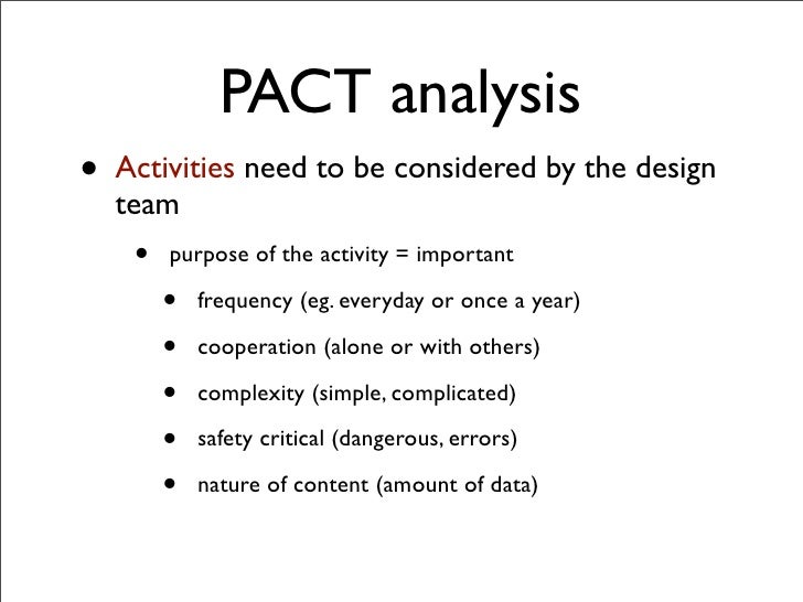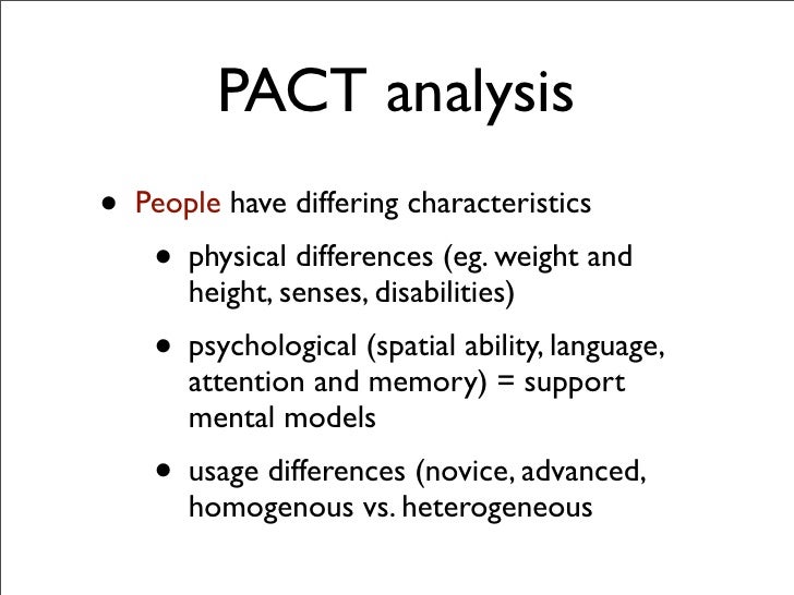 ACTS analysis, we can further understand the ways and means of how the author creates a state of mind and depicts the style effectively The most vital component of any story is the plot and through it, the author associates the style of the novel. Using PACT A framework for writing, speaking, and thinking This 5minute video (created by Biology Professor Dana Huebert Lima for the WVU Honors College) includes examples and activities. L04 PACT Analysis (Fall 16 Human Computer Interaction Course, UVM) Duration 4910 Language English Location United States Restricted Mode Off History Help.