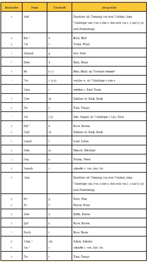 Lernen Sie das hebräische Alphabet kennen Wir zeigen Ihnen den hebräischen Buchstaben, seinen hebräischen Namen, die Umschrift und Hinweise zur Aussprache. Lernen Sie nun das hebräische Alphabet kennen Wir zeigen Ihnen in der nachfolgenden Tabelle jeweils den hebräischen Buchstaben, seinen hebräischen Namen, die Umschrift in lateinischen Buchstaben und schließlich auch Hinweise zur Aussprache. The Hebrew alphabet is read from right to left It is composed of 22 consonants, five of which have final forms that are used at the end of words It can also be called Jewish, square or block script Besides Hebrew, it is also used when writing Yiddish and Ladino, a JewishIberian language based on old Spanish.