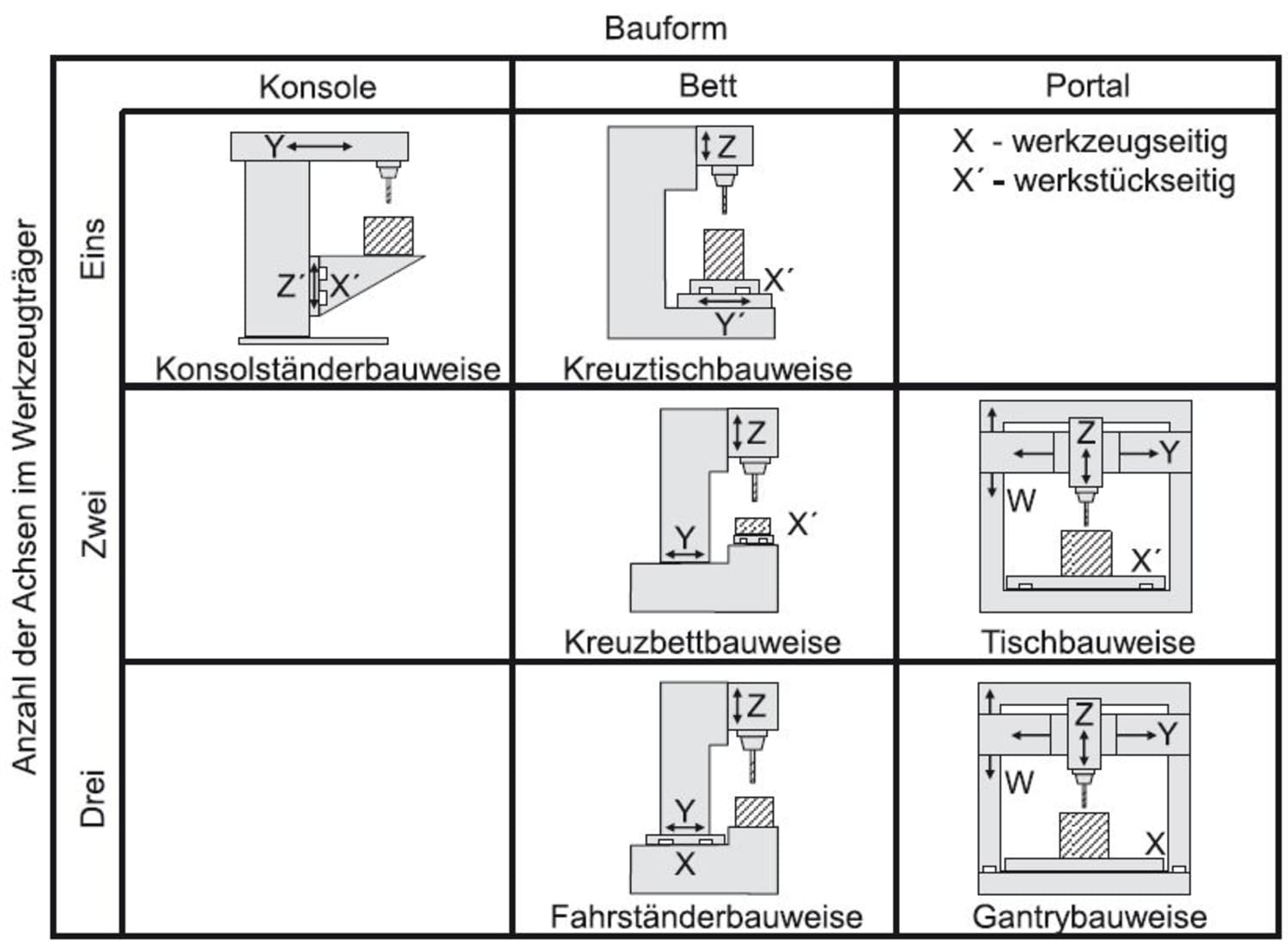 Das Werkzeug wird am so genannten Fräserschaft in die Werkzeugaufnahme der Fräsmaschine eingespannt Fräser gibt es in unterschiedlichen Abmessungen, Formen, Materialien und Qualitäten Für das Zerspanen von weichen Materialien wie Kunststoff oder Holz sind andere Schneidwerkzeuge notwendig als für die Bearbeitung von harten und höherfesten Werkstoffen wie zB gehärtetem Stahl. Beispiel Fräsmaschinen Bild 121 Bauformen horizontaler Bohr und Fräsmaschinen () Weck Die Bauformen horizontaler und vertikaler Bohr und Fräsmaschinen lassen sich nach ihrer Gestellbauform und der Verteilung der Bewegungsachsen auf Werkzeugträger bzw Werkstückträger untergliedern. Im folgenden zeige ich dir, wie du eine Auswahl zugunsten oder gegen eine Linearführung treffen kannst Wirkprinzipien von Linearführungen Bei Linearführungen wird grundsätzlich zwischen Gleitführungen und Wälzführungen unterschieden.