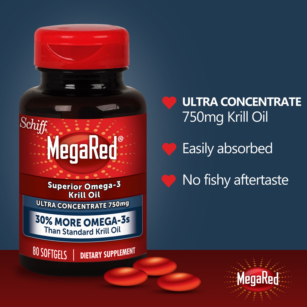 Schiff MegaRed Omega3 Krill Oil, Ultra Concentrate 750 mg, 80 Softgels 100% Pure Krill OilUltra ConcentrateProvides 30% More Omega3s per mg vs Standard Pure Krill OilSupports 3 Markers of Cardiovascular HealthOne Softgel per Day. Compared to fish oil, krill oil contains higher amounts of astaxanthin—a carotenoid pigment that gives krill and other crustaceans their characteristic redpink color 2 Unlike many other antioxidant substances, preliminary studies have found that astaxanthin may cross the bloodbrain barrier and protect the brain and central nervous system from free radical damage. The Omega3 fatty acids that occur in red krill oil, namely eicosapentaenoic acid (EPA) and docosahexaenoic acid (DHA) are considered to be healthy for the heart They can improve blood lipid levels and studies show that krill oil might be particularly effective at lowering the levels of triglycerides and other blood fats.