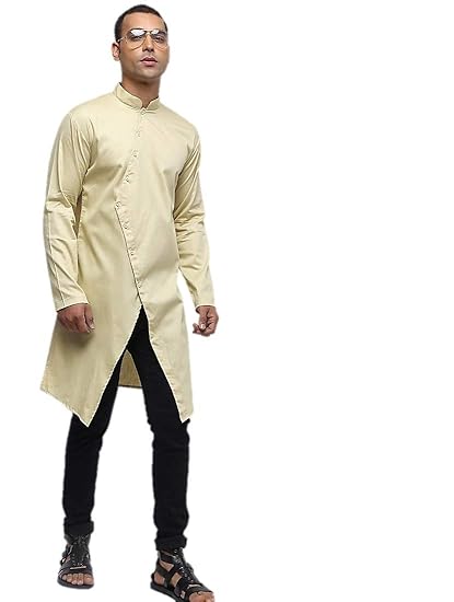 Buy Nirwe Men S Stylish Ethnic Beige Cotton Asymmetric Solid Designer Kurta For Casual At Amazon In